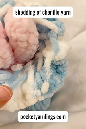 This is especially true when using chenille chunky yarn, maybe less so with other materials like cotton or wool. If you make a mistake and start to pull on the yarn to unravel it, it can get caught or stuck, which makes the yarn shed and the strand gets thinner and thinner. Sometimes, it will just get tangled and you cannot untangle it.