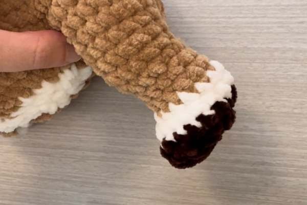 Stuff the left hind leg. Switch to white yarn. Cut off brown yarn.