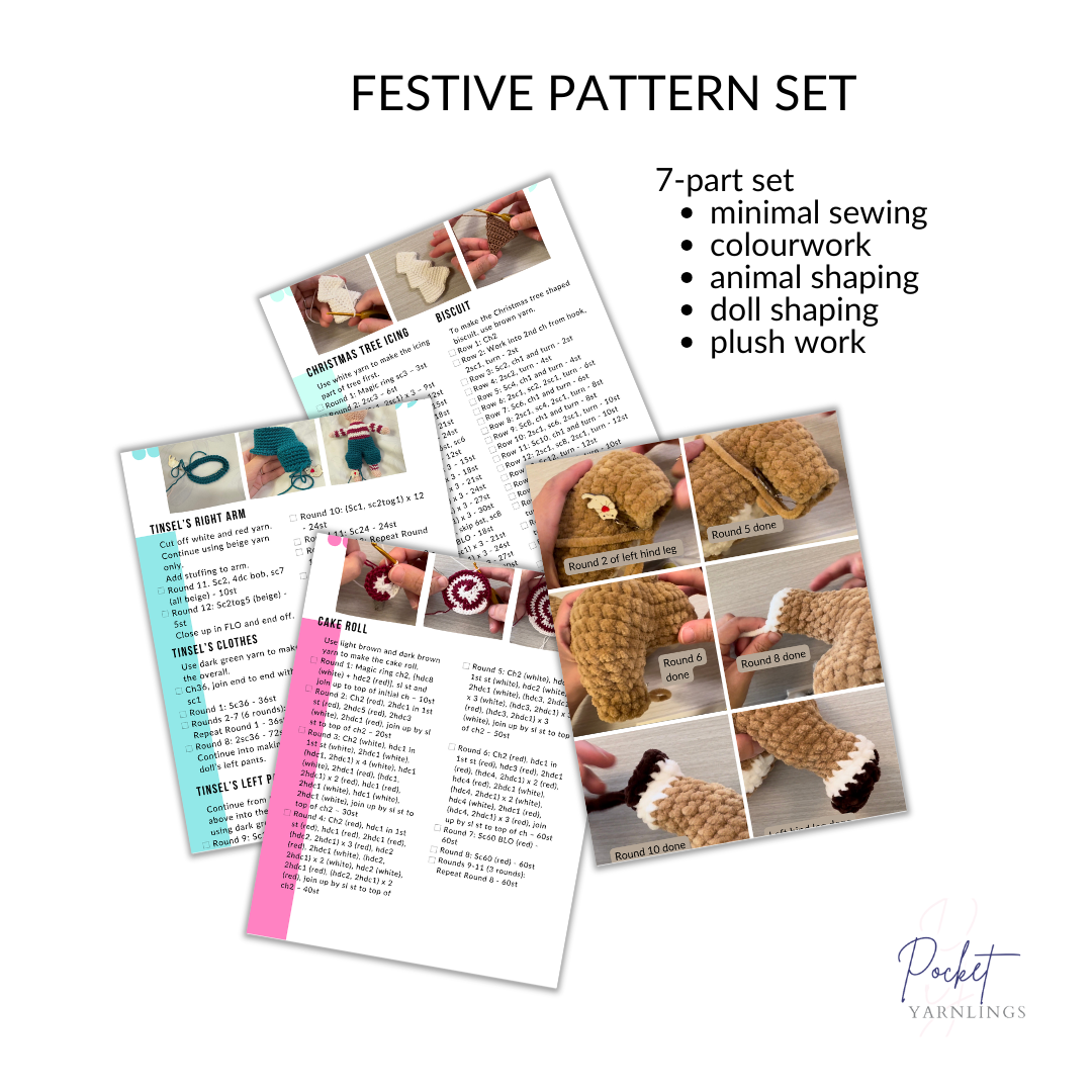 • 🎥 Lifetime access to all crochet-along videos — the 9-part CAL for the main plush plus 5 smaller festive snack tutorials, so you can follow along at your own pace.
